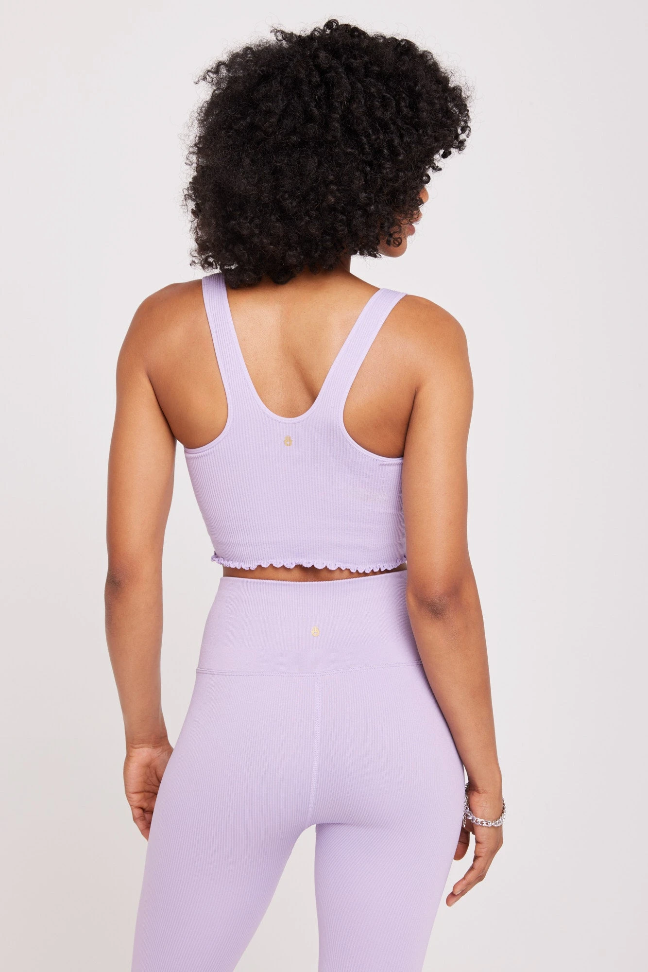 Do all things with love. A crop tank with built-in shelf bra, supportive straps, and a racerback cut with a ruffle hem. Made from our compressive & soft seamless rib fabric.