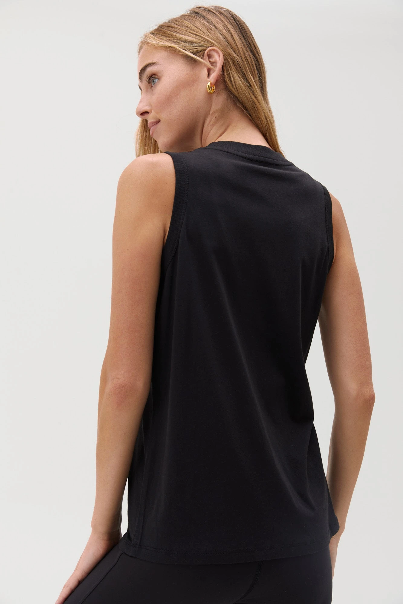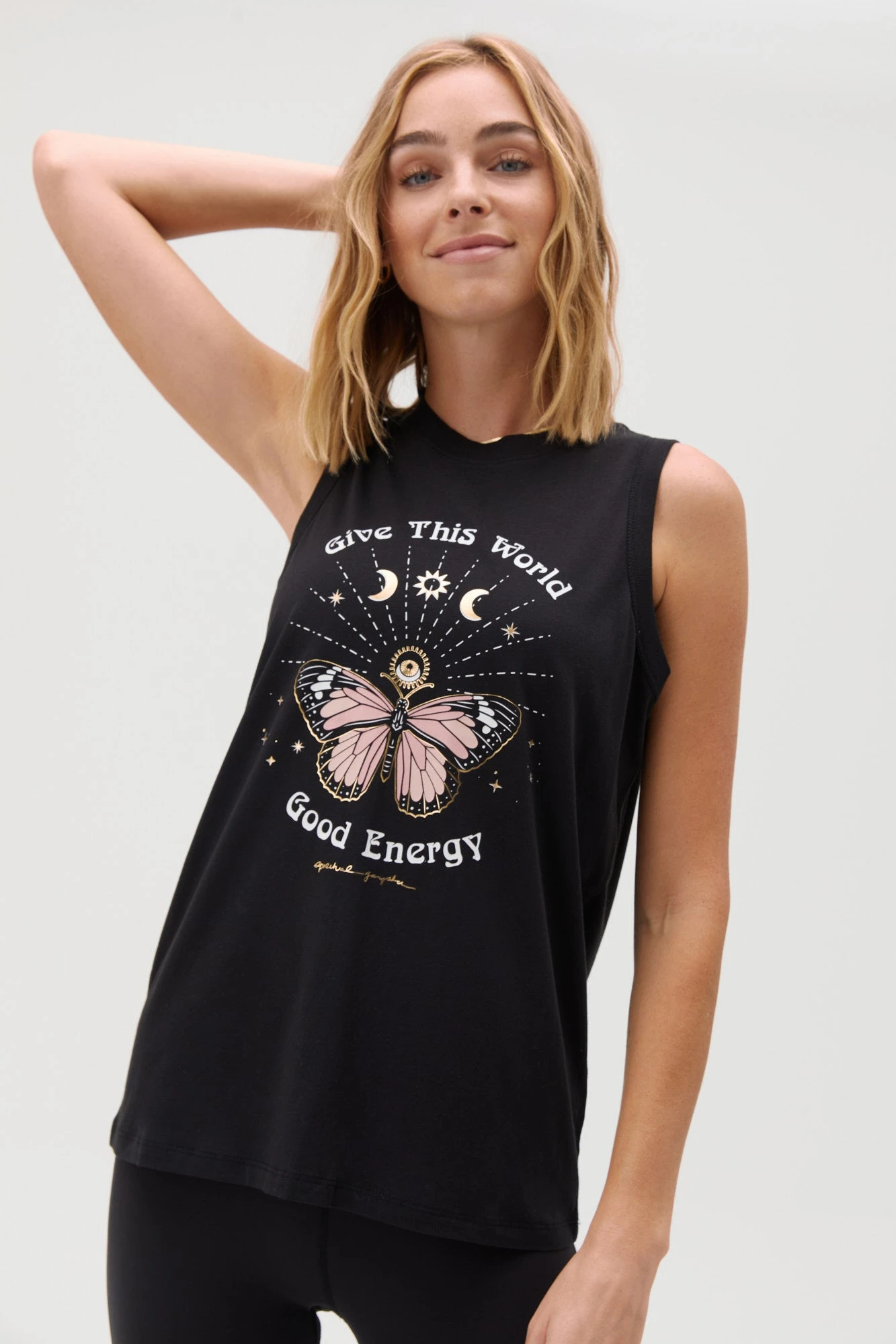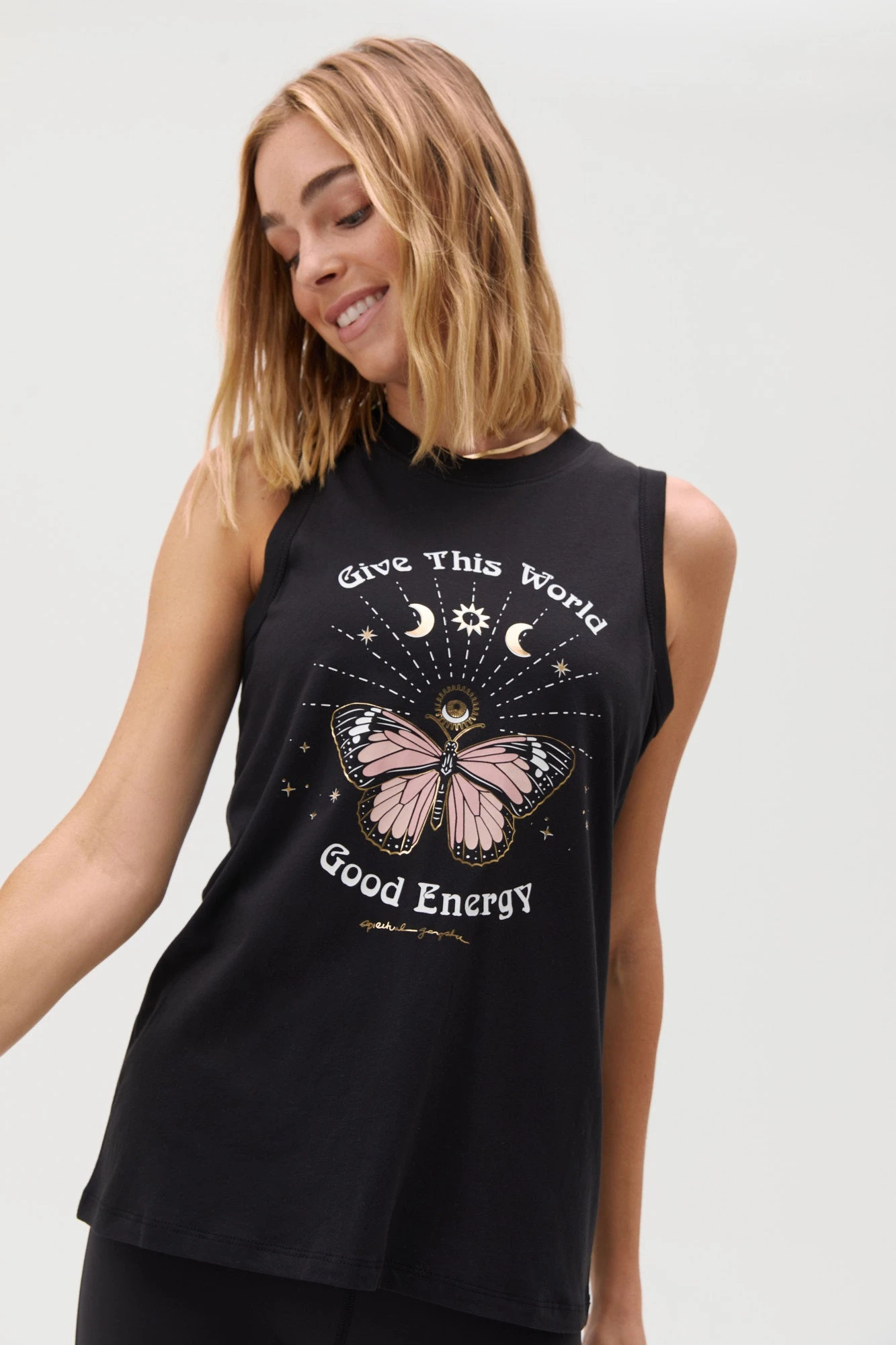 Good energy abounds. Designed in a soft, modal jersey fabric, with gold foil details, cut for a slightly longer length to keep you covered through downward dog and beyond — its a must-have tank that truly lives up to its name.
