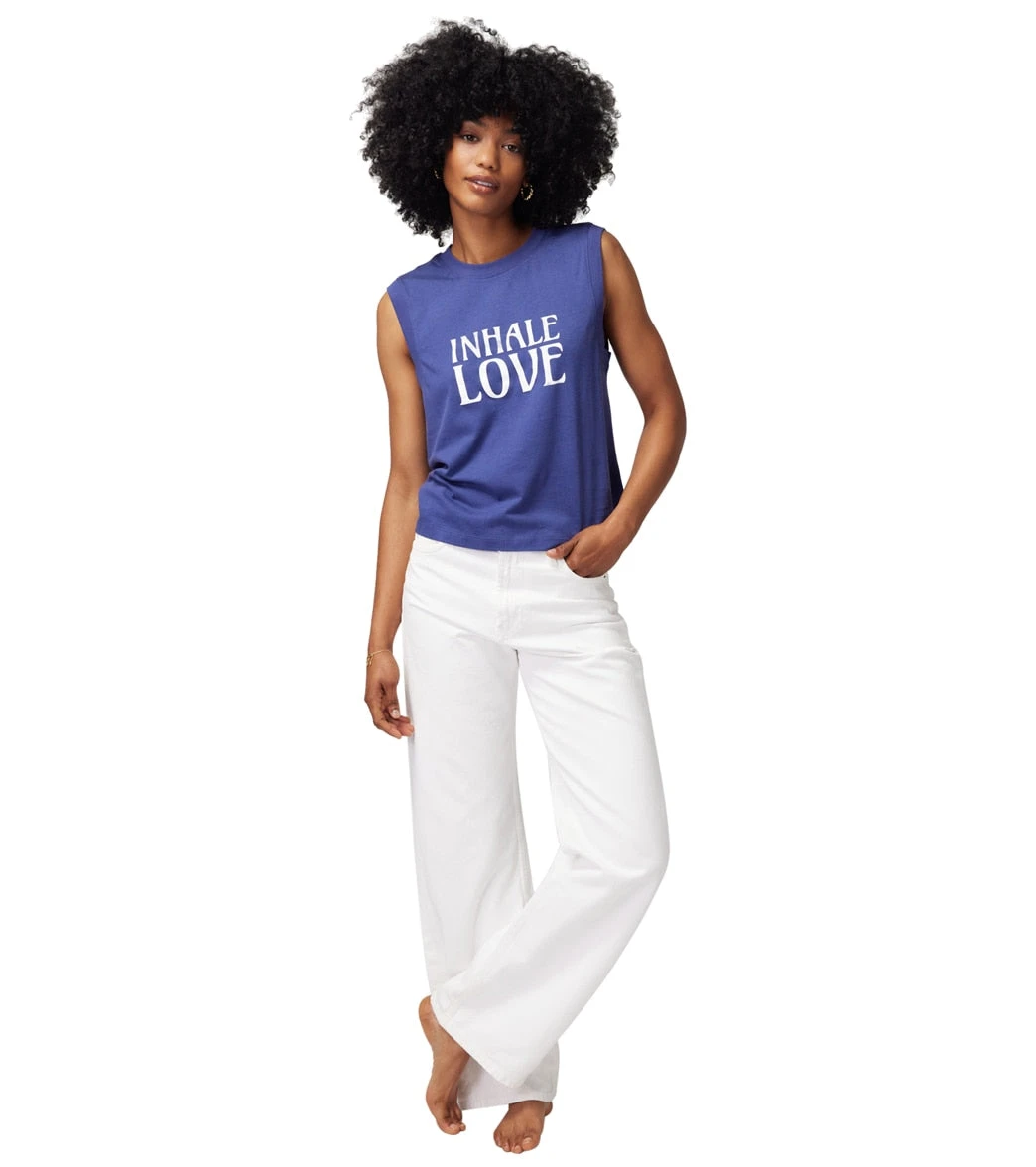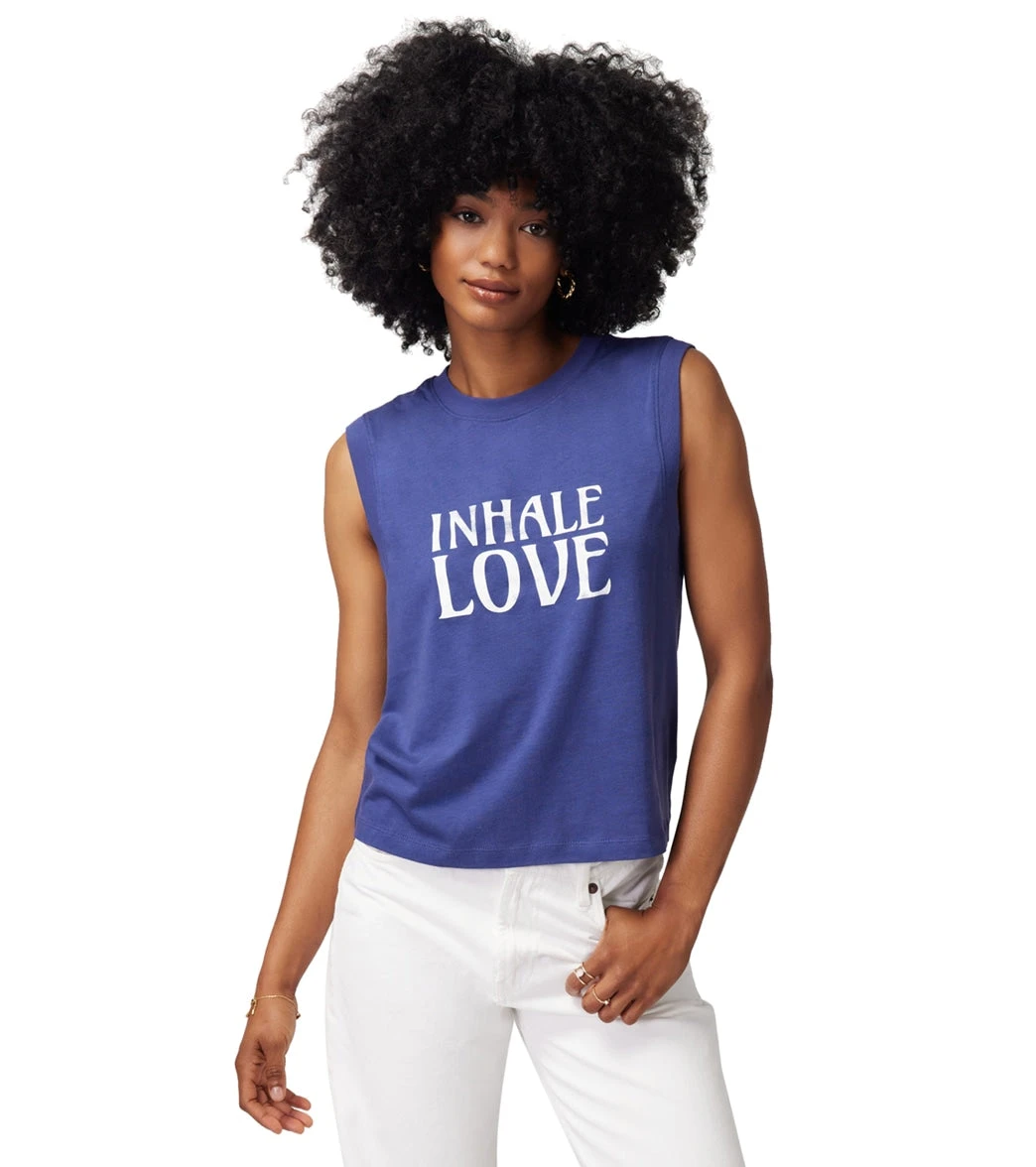 The Spiritual Gangster Inhale Love Irina Muscle Tank with an “Inhale and Exhale” graphic is designed for incredible breathability for all your sweat sessions, featuring a slim fit, slightly dropped armholes, and hits at hip length.