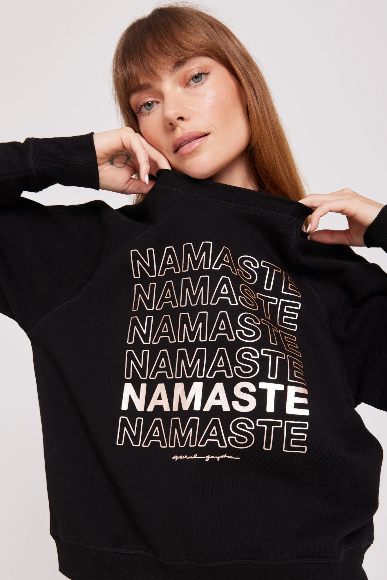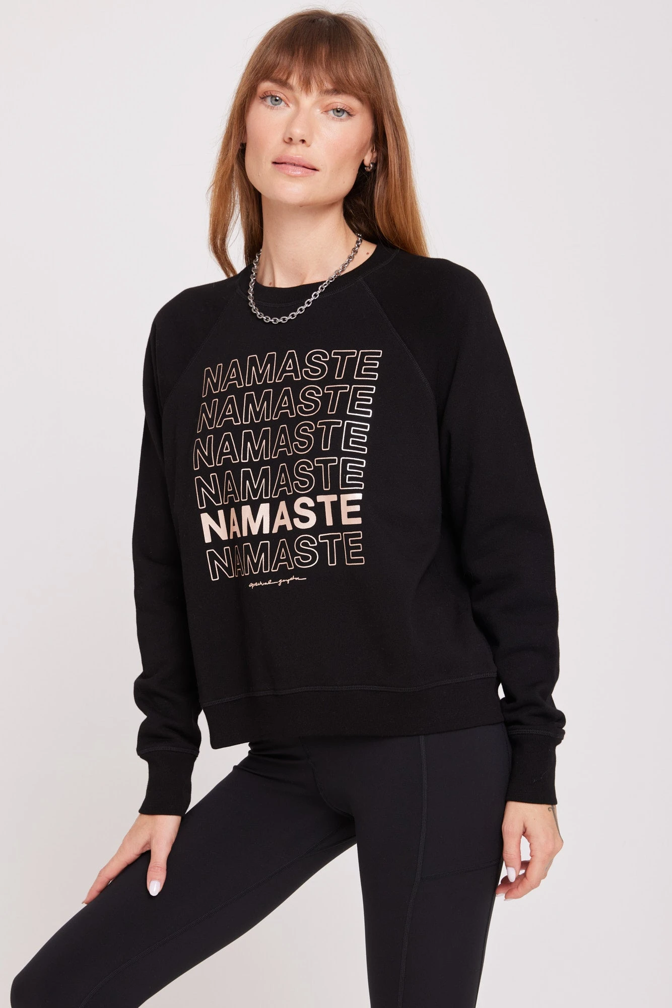 Namaste all day. Best-selling Bridget Raglan Pullover, designed in a relaxed fit with dropped armholes, featuring a new gold foil Namaste graphic. Made with 100% cotton.