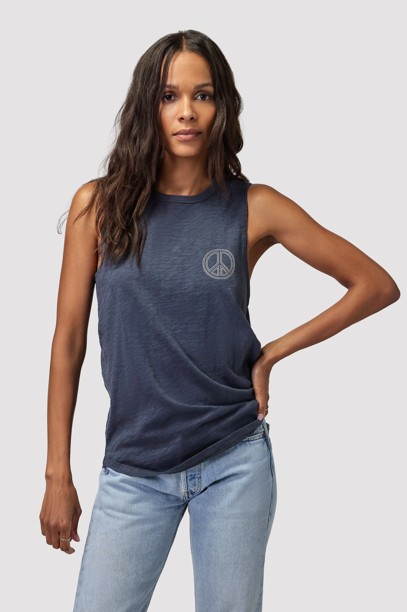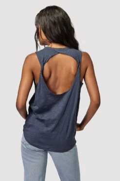Be at peace. A relaxed fit tank designed with rib binding at the neck, slightly dropped armholes, and a keyhole opening with a twist-back detail. Made with 100% cotton.