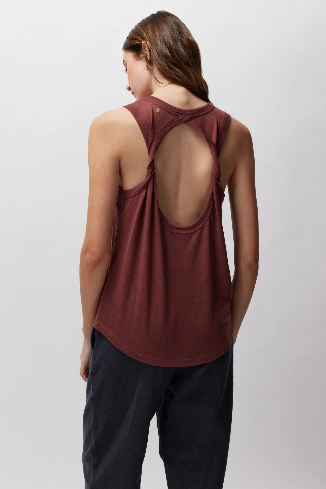 Here for the plot twist. A soft tank designed with rib binding at neck, slightly dropped armholes, and a keyhole opening with a twist back detail. Made with cotton and modal for a comfortable, relaxed fit.